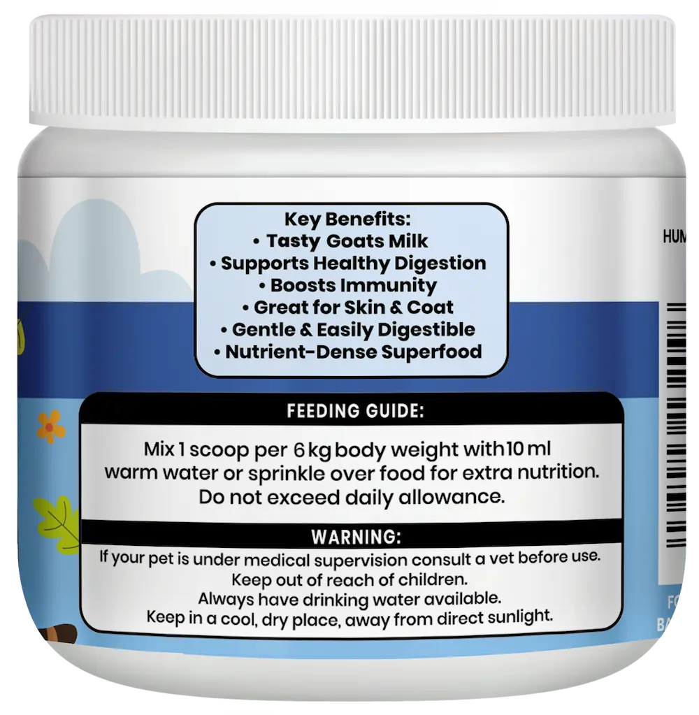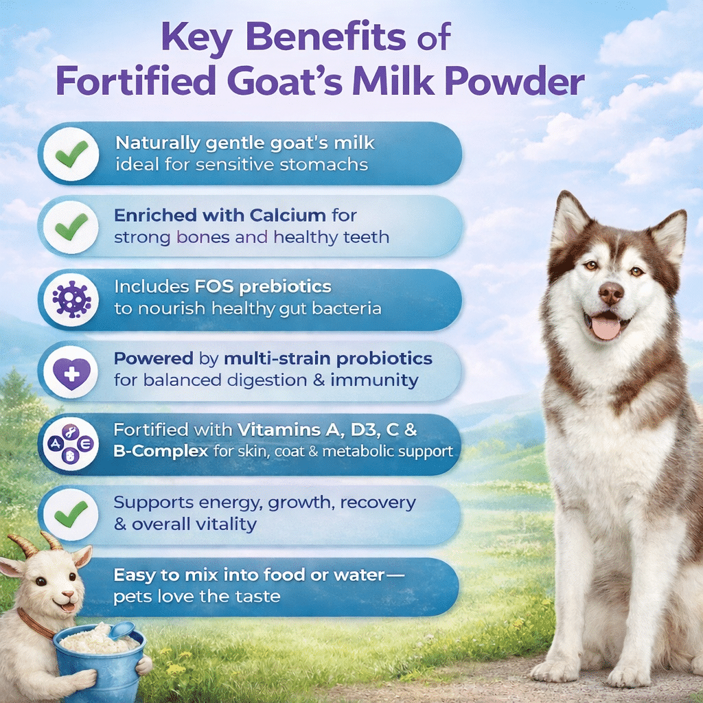 Fortified Goats Milk Powder is a gentle, nutrient-dense supplement designed to support digestion, immunity, skin & coat health, bone strength, and overall vitality in dogs and cats of all ages.